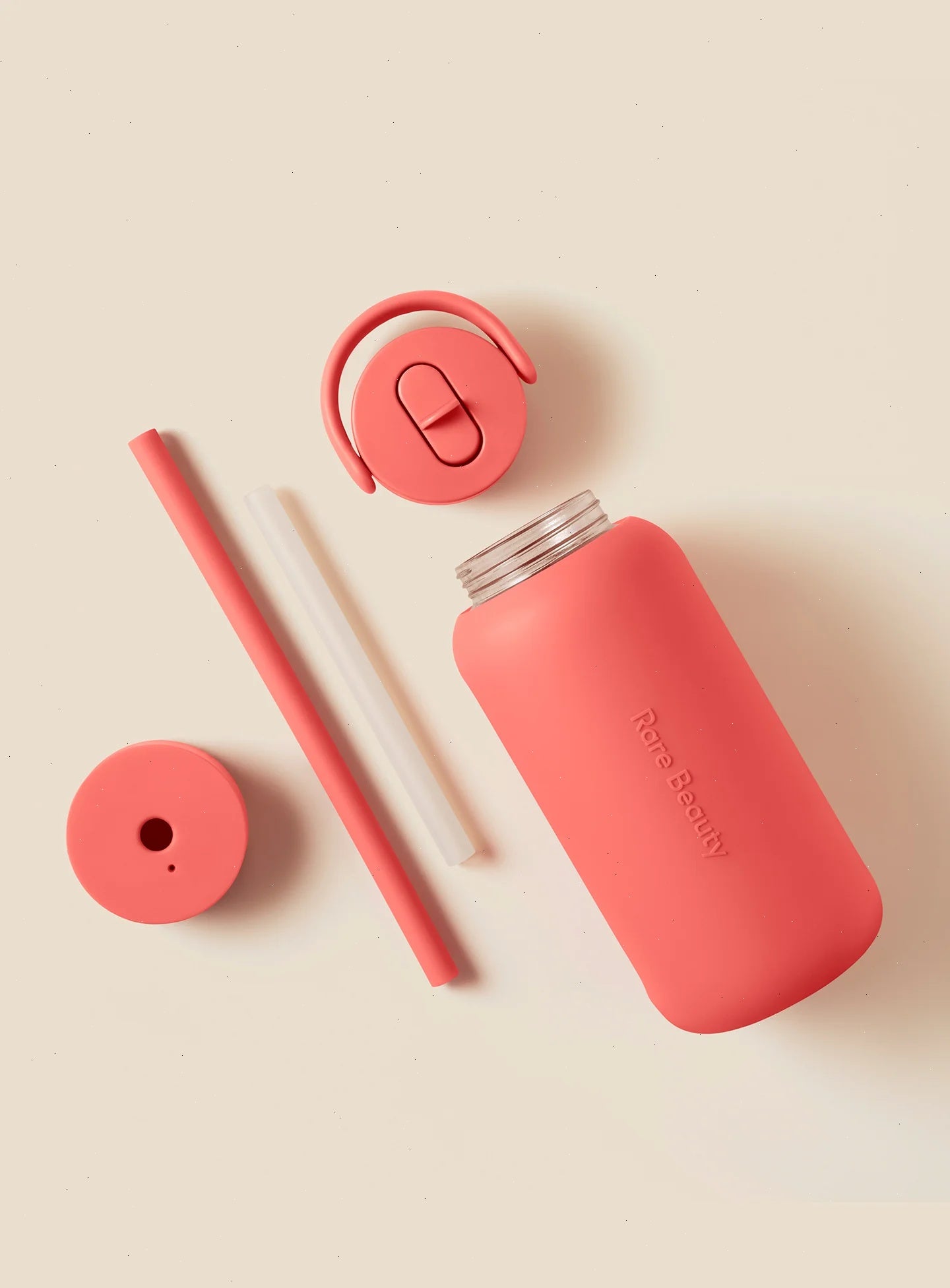 Sleek borosilicate glass bottle—safe for both hot and cold drinks—is wrapped in a protective silicone sleeve with custom embossed Rare Beauty and Bink logos for a comfy, non-slip grip.